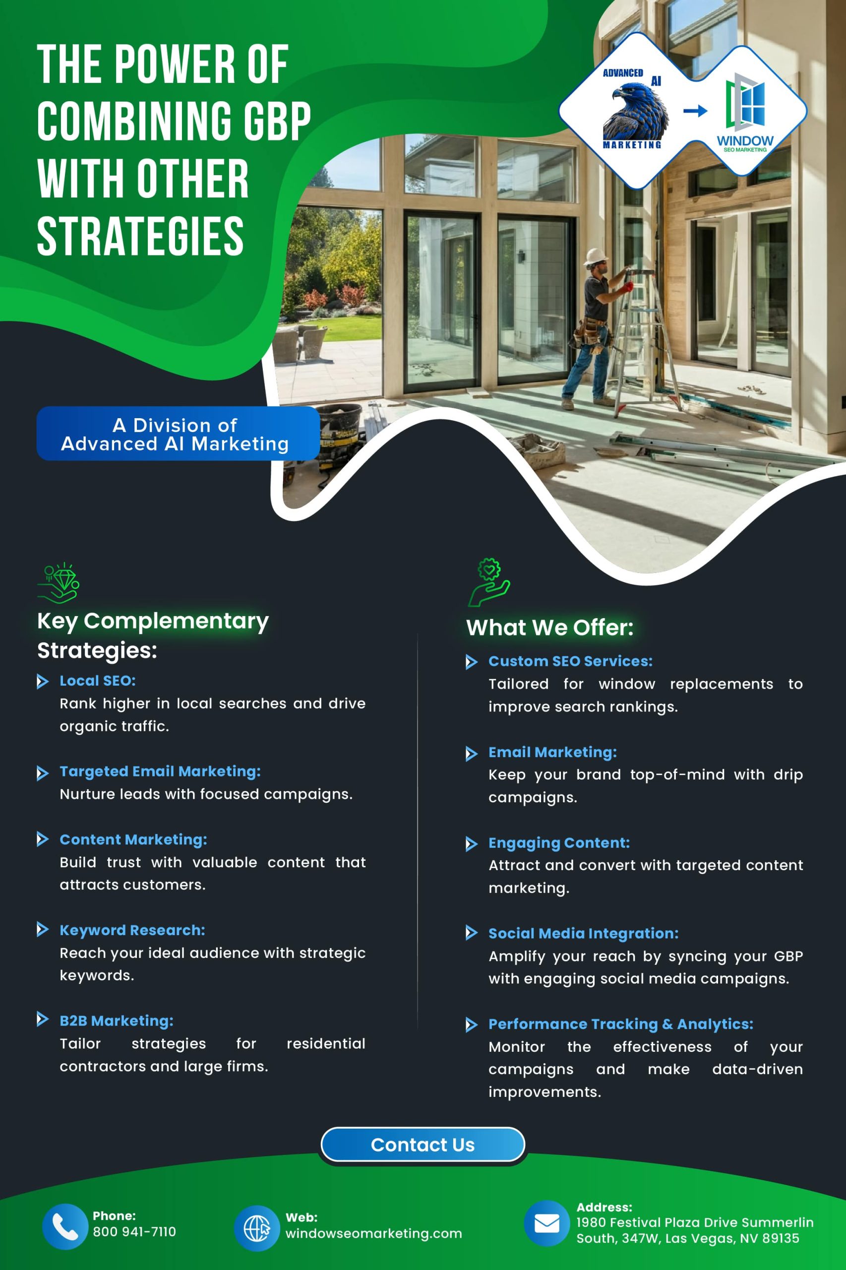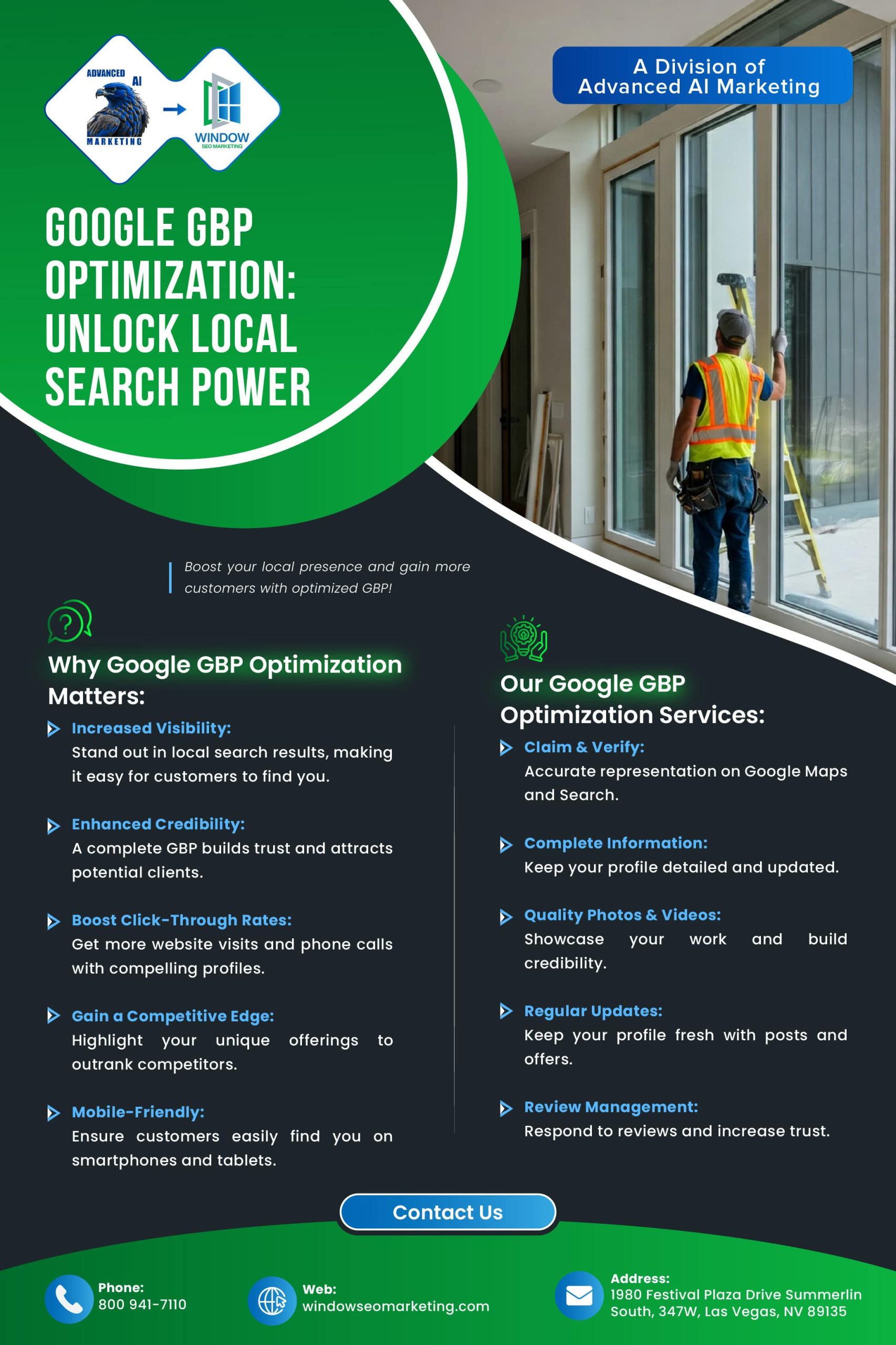 In today’s digital world, where homeowners turn to Google to find everything from restaurants to window replacement services, having a strong presence on Google Business Profile (GBP) is crucial. At Window SEO Marketing, we specialize in optimizing your GBP listing to ensure you stand out from the competition and attract high-quality leads. π